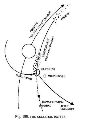 . This passage is almost self-explanatory. On the its second orbit MARDU collides with TIAMAT, splitting her in half. Then one of remaining satellites of MARDUK, one called “North Wind”, crash into the separated half. The blow was heavy enough to push this half into an orbit closer to the Sun. Earth had been created. This half along with it satellite KINGU, our moon, moves into the present day orbit of Earth.